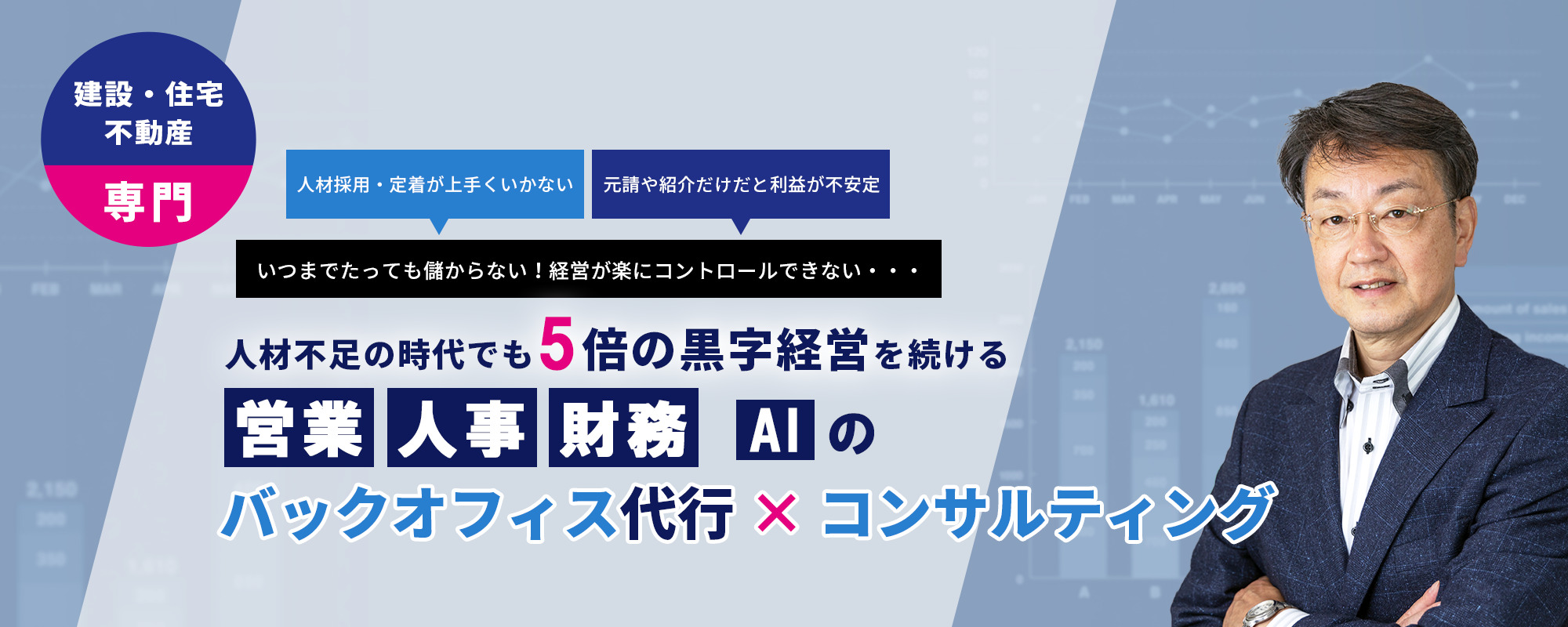建設業の経営企画とバックオフィスの支援に関わって以来、どうしたら社長の手間を減らして、営業利益率を上げられるのか10年間模索してまいりました。その結果、「現場予算管理・マーケティング・人材戦略」の管理部門の業務を代行しながら、正しい仕組みづくりで5か月で営業利益率が20%超えの体質に改善することに成功しました。これは平均的な建設業の約2倍の利益が出ることを意味します。